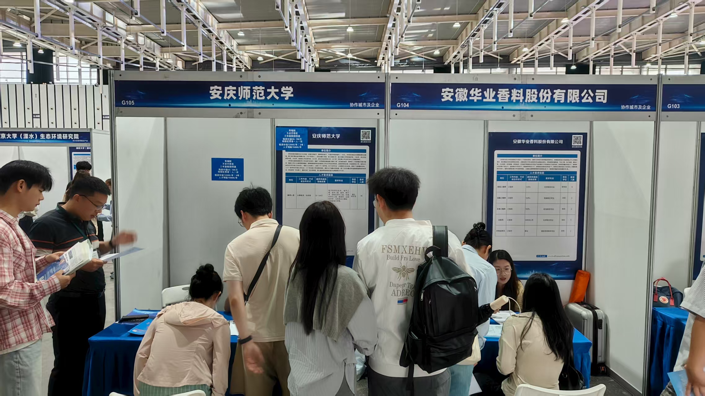 我市精准对接湖南大学博硕研究生双选会与南京留学生青年人才交流(招聘)会两大高端平台,组织8家重点企事业单位参会引才,企业展位前英才汇聚,充分展现安庆广纳贤才的开放姿态。